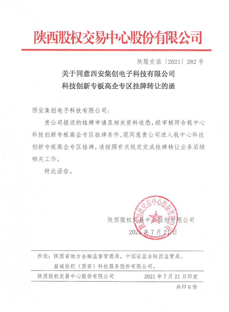 2021年7月21日,西安集創電子科技有限公司在陜西股權交易中心“新四板”成功掛牌。區領導及西安市經濟開發區、區招商局、區經信局相關負責人前往見證了掛牌儀式。