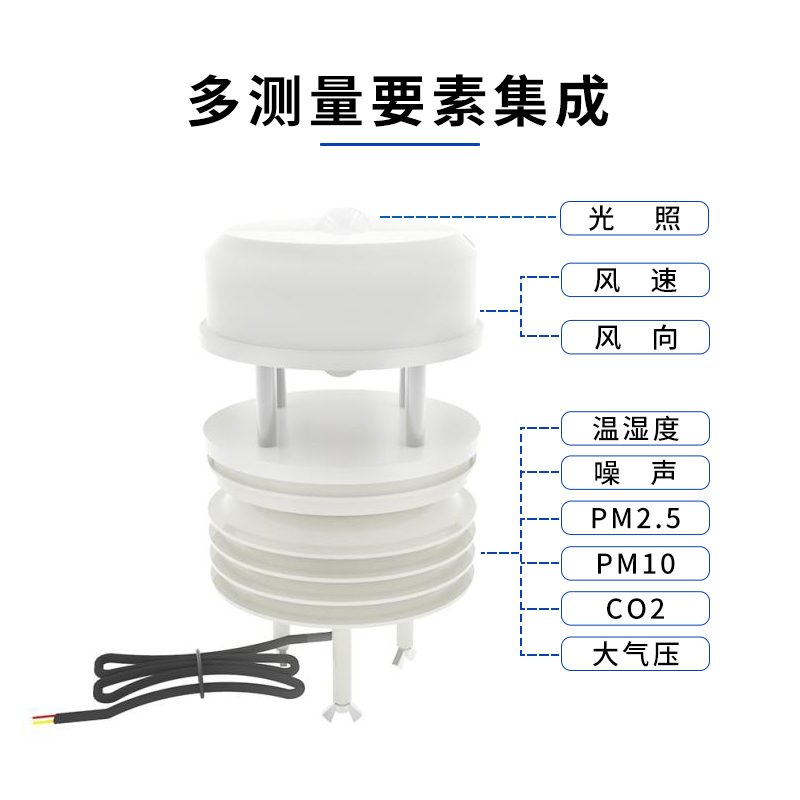 該一體式氣象站可廣泛適用于環境檢測,集風速、風向、溫濕度、噪聲采集、PM2.5和PM10、CO2、大氣壓力于一體,設備采用標準MODBUS-RTU 通信協議,RS485信號輸出,通信距離最遠可達2000米,可將數據通過 485 通信的方式上傳至客戶的監控軟件或 PLC 組態屏等,也支持二次開發。